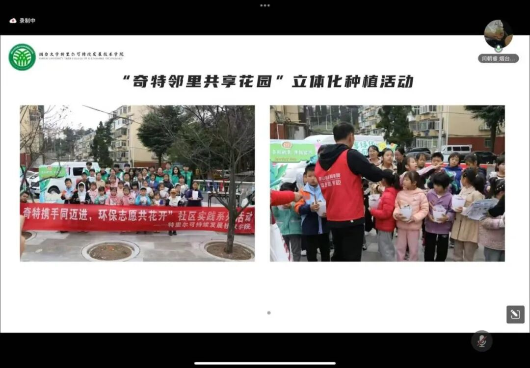 作为活动发起方,烟台大学中德特里尔学院重点分享了核心环保项目——“奇特花园”。该项目以“公共绿色空间为载体,联动专业力量、社会组织和居民共建园艺”为核心理念,形成了可复制、可推广的绿色共建模式。其中,奇南社区作为项目样板,围绕“零废弃、强互动、重参与”打造五大功能板块:零废弃花园巧用回收啤酒瓶、汽水瓶等材料造景,设科学堆肥区实现园林废弃物“零外运”;口袋花园由孩子参与照护植物,搭配知识卡片打造“可阅读的绿色空间”;立体化种植通过绿植架、壁挂花盆拓展垂直绿化;共建花园让居民全程参与建设,结合节日开展亲子活动;绿植医生则提供专业养护服务,推进社区绿色驿站改造。此外,项目还延伸至塔山、御龙山等多个社区,打造“一区一特色”,如塔山社区的休闲花园小景、御龙山社区的“宠物便便跑道”等,实现环保理念多元落地。