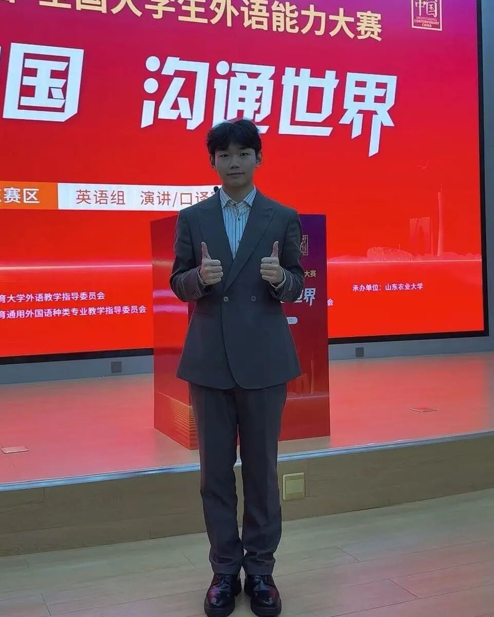 王浩楠在省赛中斩获金奖,心中满是喜悦与释然。这份荣誉是对他数月付出的肯定,也开启了国赛新征程。备赛期间,学院提供充足备赛保障与资源支持,助力多维度实战演练,在指导老师王怡宁以及雅思团队王丹老师的指导下深耕细节、屡克难关,不断优化表达。作为外研社演讲赛道唯一代表烟台大学斩获省赛金奖并成功晋级国赛的选手,即将在全国舞台上展现烟大学子的风采,他将秉持初心,深耕积淀、磨砺心态,在国赛舞台传递中国青年力量。