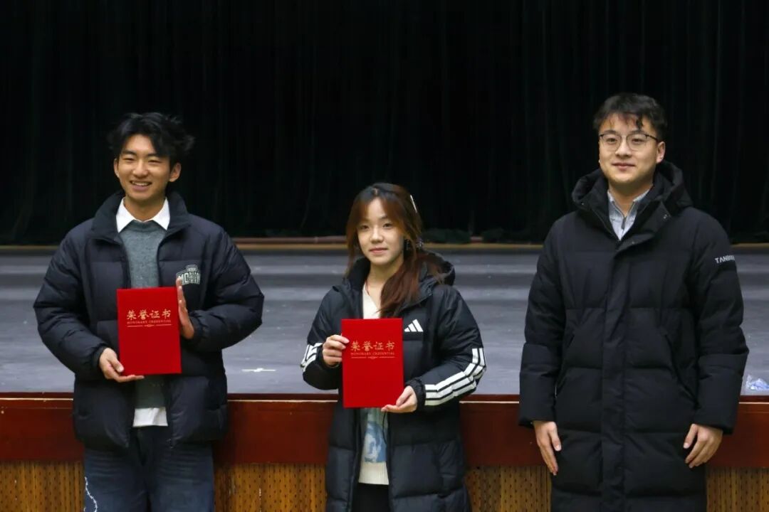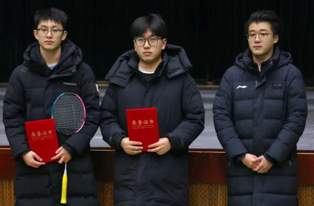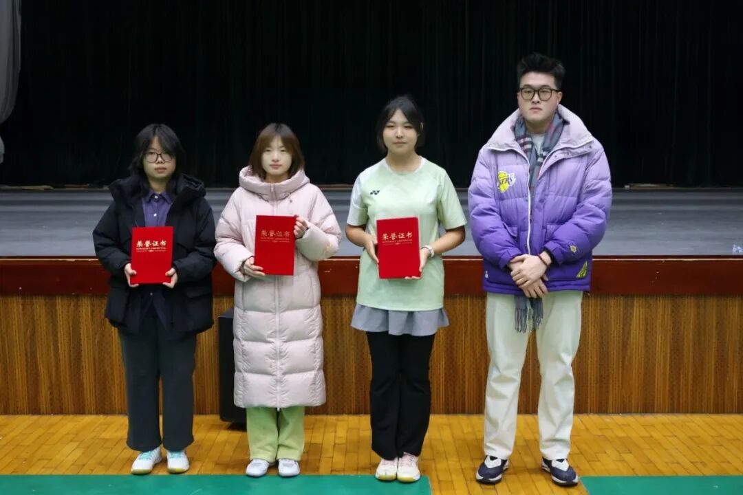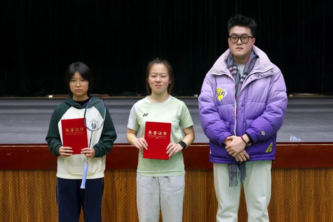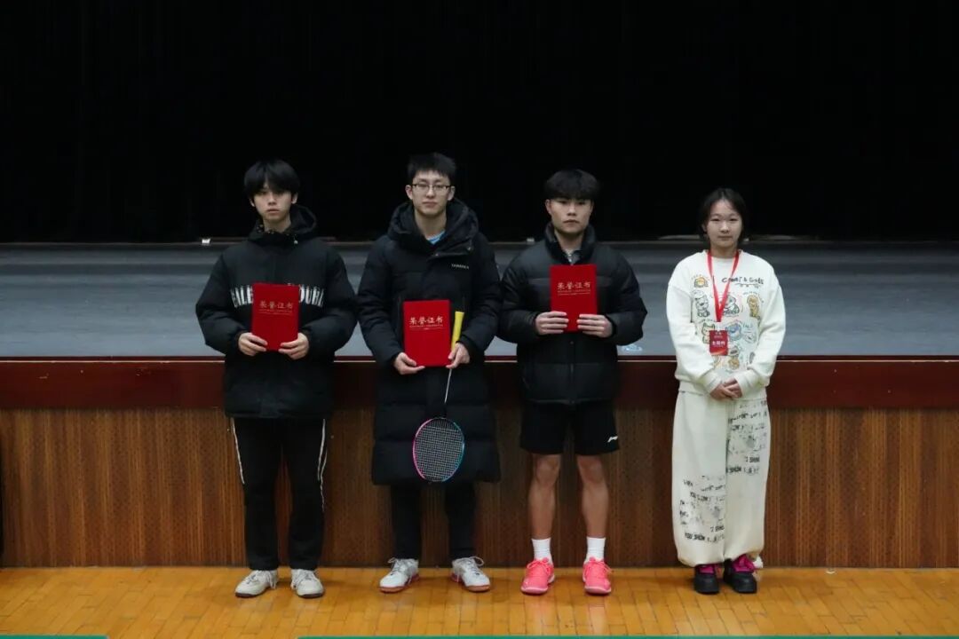 颁奖环节中,校学生会主席团成员王一民、校学生会办公室主任尹长浩、校学生会文体部部长黄帅朋、校羽毛球协会副会长王佳慧、特里尔可持续发展技术学院学生会主席团成员庄梓翌,分别为混双、男双、女双、男单、女单获奖选手颁奖