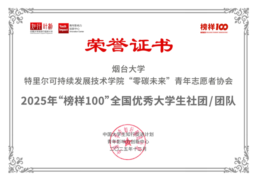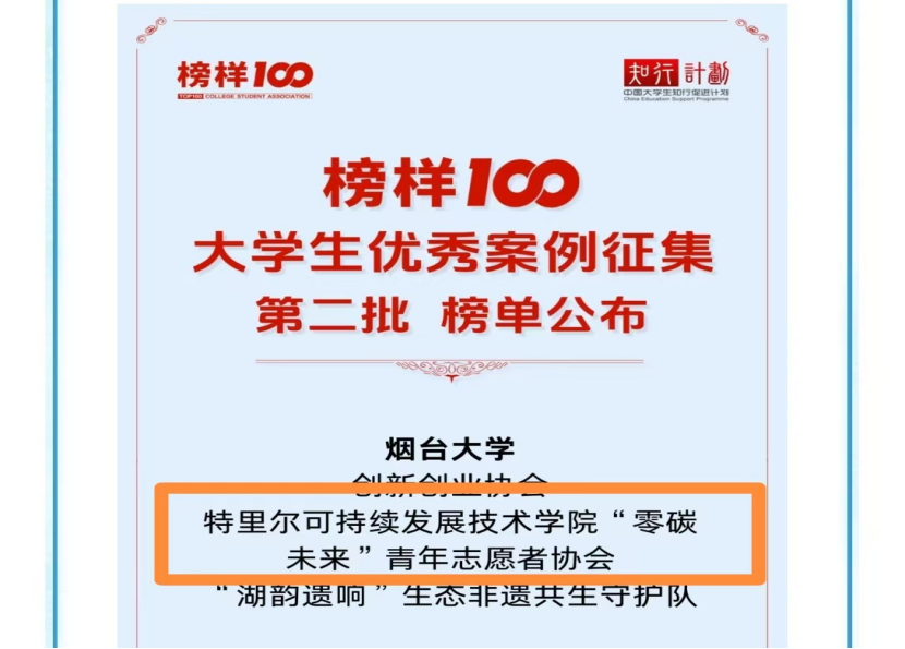 近日,烟台大学中德特里尔学院“零碳未来”青年志愿者协会获评全国“榜样100”优秀社团。这份荣誉是对我院学子践行可持续发展理念的高度认可。