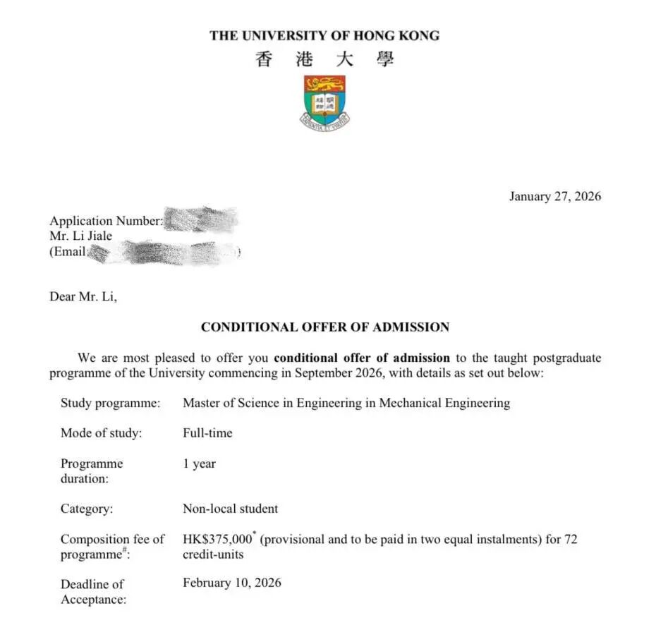 近日,中德特里尔学院2022级车辆工程专业本科生李佳乐同学凭借优异的学业成绩与突出的综合能力,成功斩获香港大学、南洋理工大学等世界顶尖高校的硕士研究生录取通知,为自己的本科生涯画上圆满句号,也为学院学子树立了榜样。